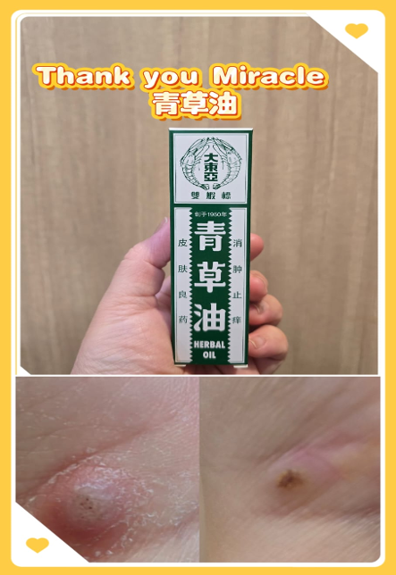 I went to see a doctor and took antibiotics and applied the prescription cream. BUT nothing has changed. The swelling and pain persist, and the area remains tender with no reduction in symptoms. Then a friend recommended this Herbal Oil 青草油 from Tai Tong Ah Co, and honestly, it’s a MIRACLE!